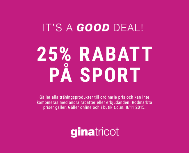 02-08 Nov 2015Just nu 25% rabatt på våra fina sportplagg!
