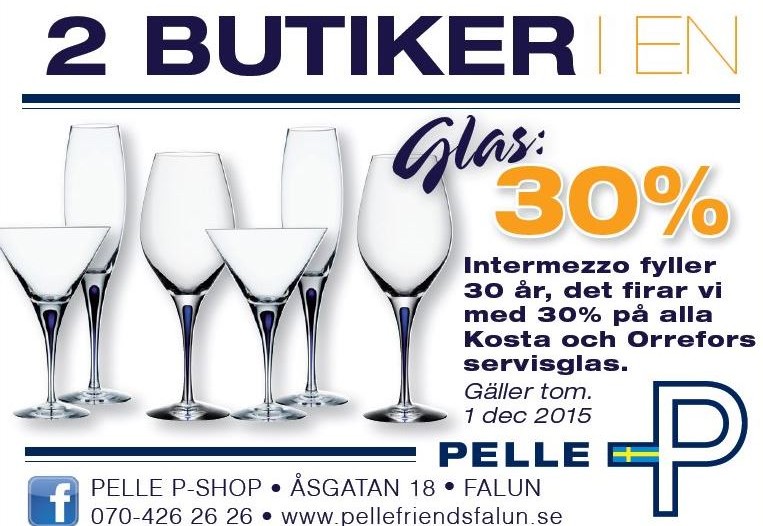 24 Sep - 01 Dec 2015 Pelle PIntermezzo fyller 30 år, det firar vi med 30% på alla Kosta Orrefors servisglas.