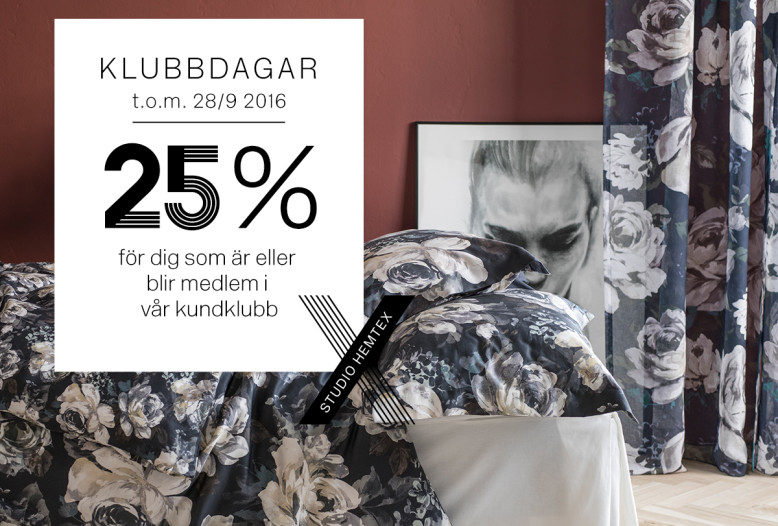 Alla som är eller blir medlemmar i vår kundklubb Studio Hemtex får 25 % rabatt på ett helt köp*.