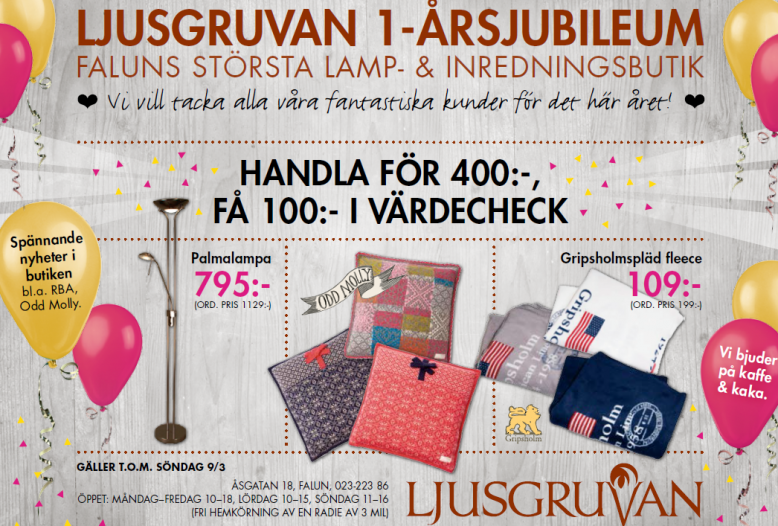 04-09 Mar 2014Faluns största lamp- och inredningsbutik firar 1-årsjubileum
