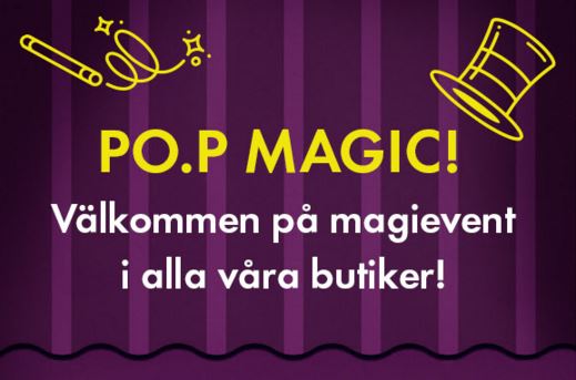 På lördag bjuder vi in alla små och stora magiker på magievent i alla våra butiker. Var med och tävla om ett magikit, klä ut dig till trollkarl, trolla med vår trollerikortlek, pyssla ditt eget trollspö och handla ur nya kollektionen PO.P Magic!