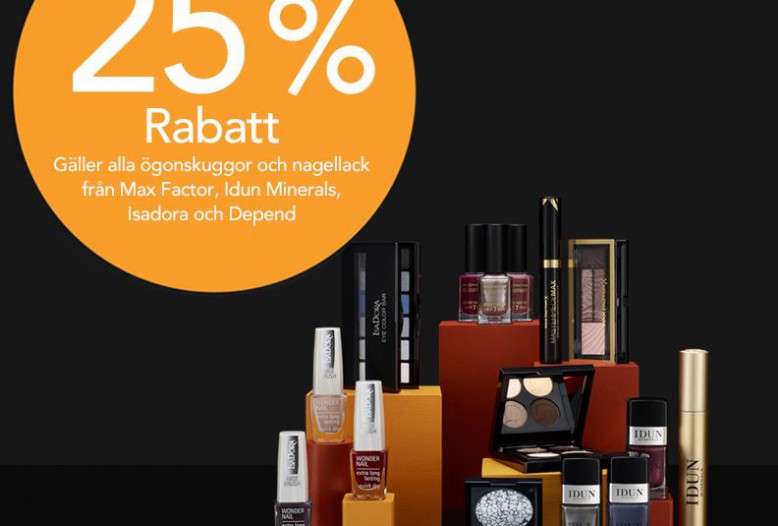 - 25% rabatt på alla ögonskuggor och nagellack från Max Factor, IDUN Minerals, Isadora och Depend.
