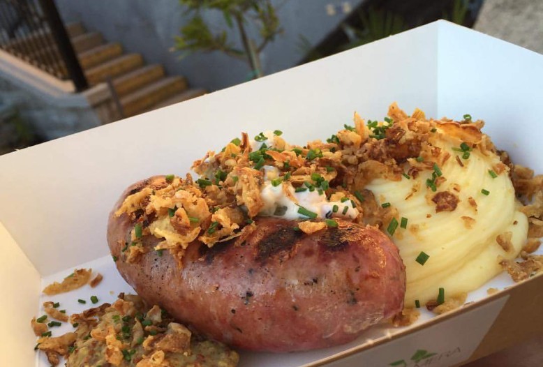 Grillad egengjord vildsvinssalciccia med potatispuré. Till det vår egen räksallad, senap och rostad lök.