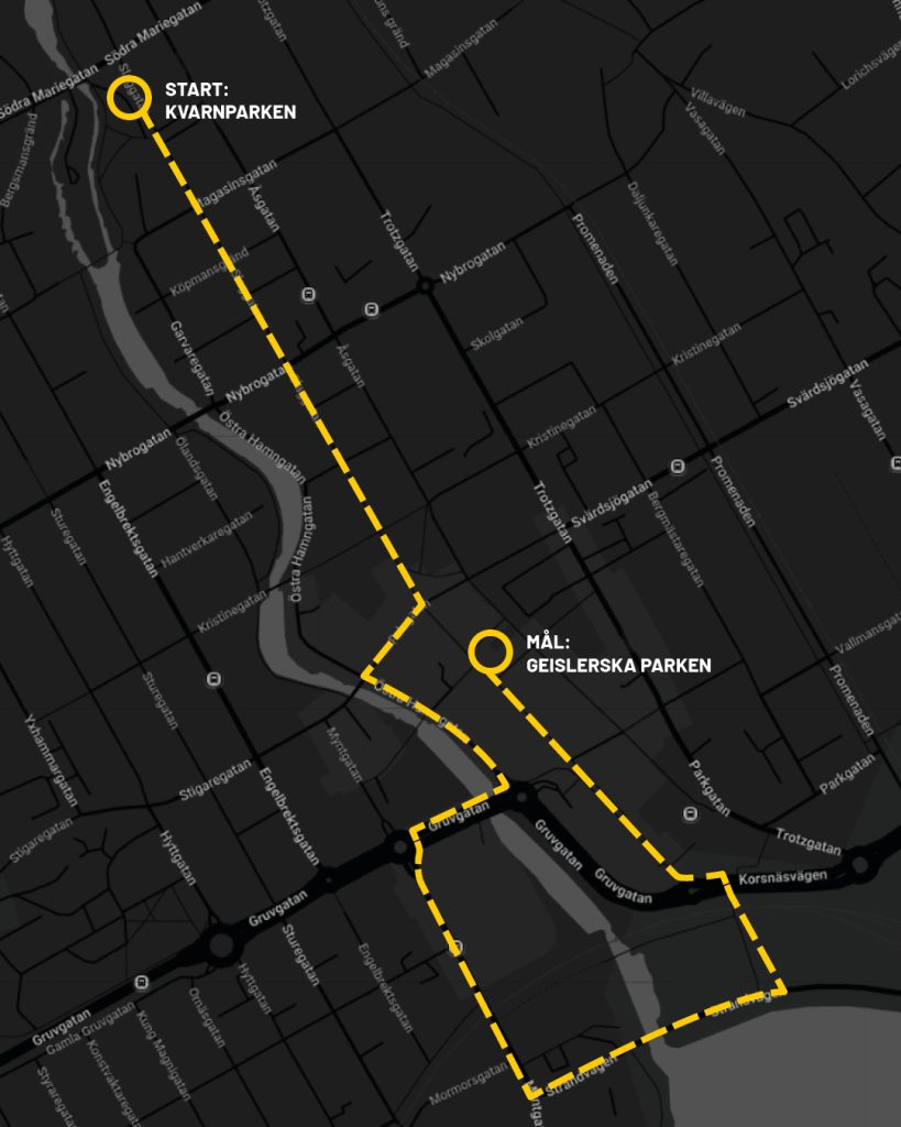 Vi startar vid Born (Kvarnparken) kl 18:00 och tar oss genom stan, mot Runn och vänder sedan tillbaka till stan för att gå i mål i Geislerska parken där det blir falukorvsgrillning.