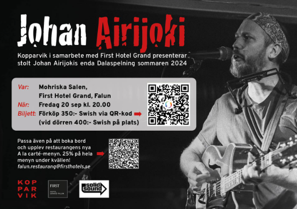 Vi har i samarbete med Kopparvik bjudit hit Johan Airijoki för hans enda spelning i Dalarna 2024. Kom och upplev en fantastisk konsert i vår vackra salong Mohriska gården, från kl. 20:00