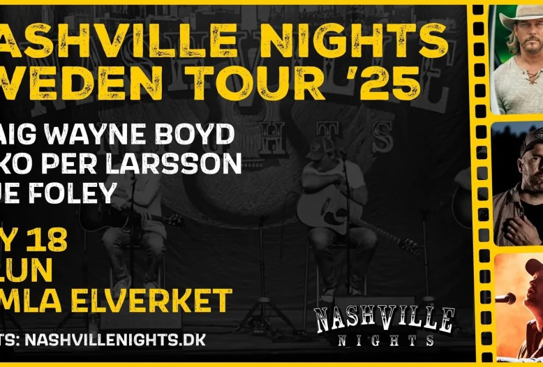 18 May 2025 19-22:30 Gamla ElverketNashville Nights Sweden Tour ’25 – Blue Foley, Craig Wayne Boyd och Stiko Per Larsson. En turné med två fantastiska låtskrivare och artister från Nashville, kryddat med en svensk artist vars musik och scennärvaro hyllas både hemma och internationellt – tre unika röster som tillsammans skapar magi.