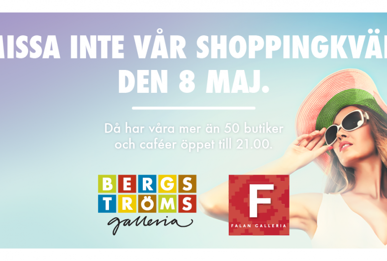 08 May 2014 Bergströms och Falan galleriaDen 8 maj är det shoppingkväll i Faluns gallerior. Välkomna till våra mer än 50 butiker och caféer, vi har öppet ända till kl 21.00. Det blir livemusik, styling, goodiebags och mängder av svårslagna erbjudanden. Vi ses!