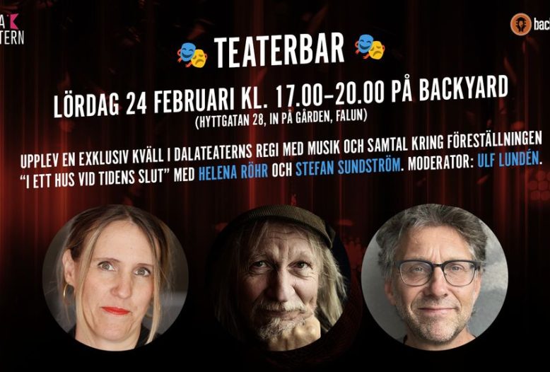 Varmt välkommen till en bakom kulisserna-afton i form av Teaterbar på Backyard med två av hjärnorna bakom den apokalyptiska farsen ”I ett hus vid tidens slut”. Regissören Helena Röhr och musikpoeten Stefan Sundströms Officiella kommer att ge unik inblick i arbetet bakom föreställningen och självklart bjuder Sundström också på några låtar. Dessutom visar vi Sundströms nya musikvideo till singeln ”Du gav ett hjärta till en bild” skriven exklusivt till föreställningen.
