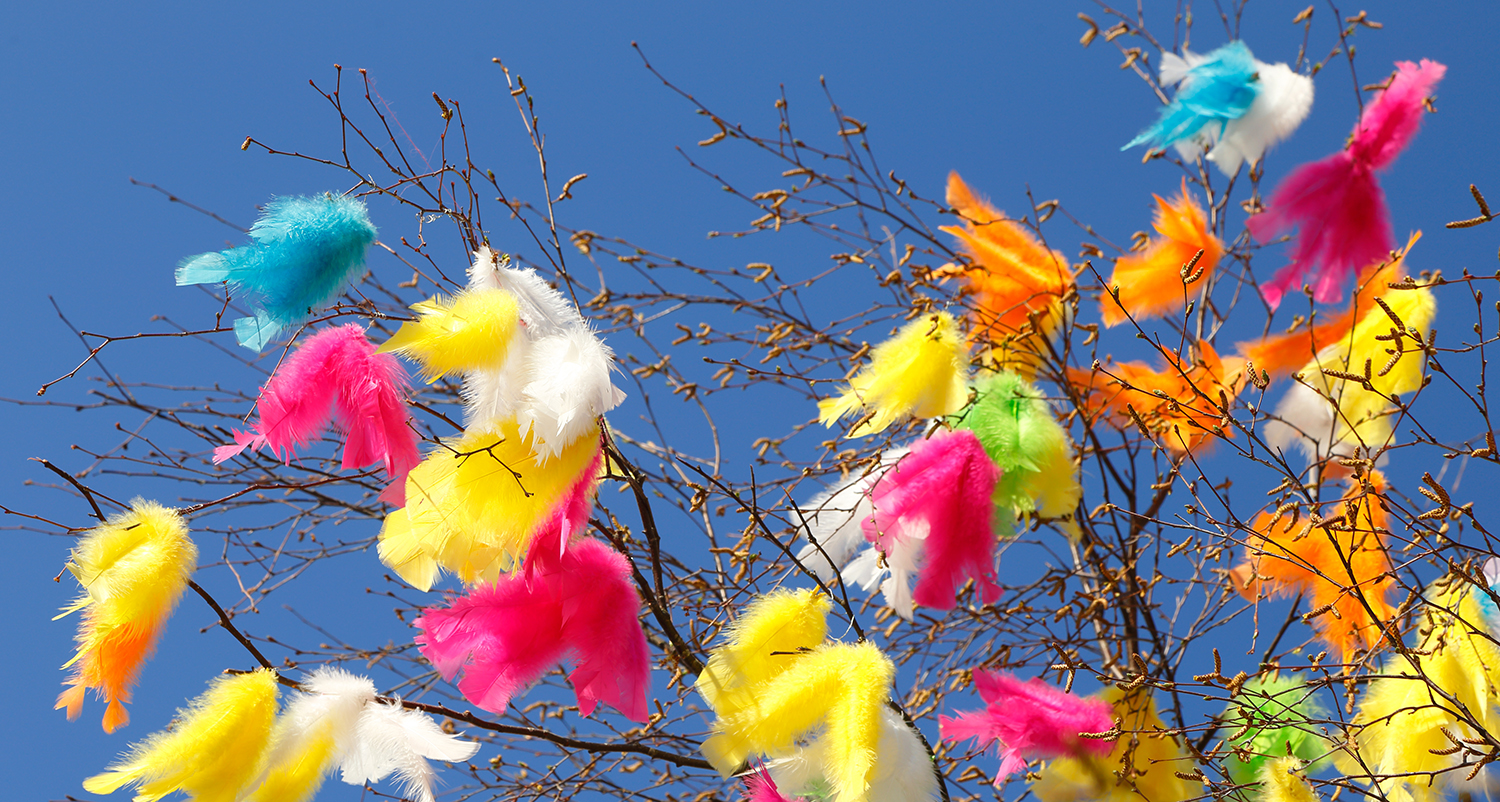 Påskfjädrar ← Föregående Nästa → Fjädrar färgstarka färger upphängda i björkris mot en klarblå himmel.